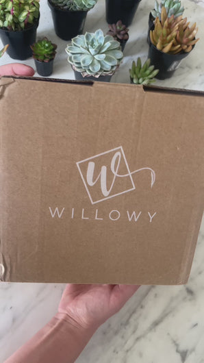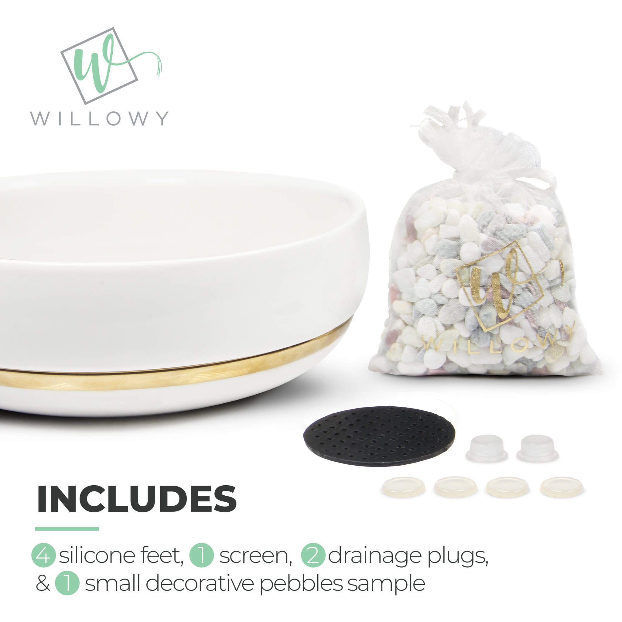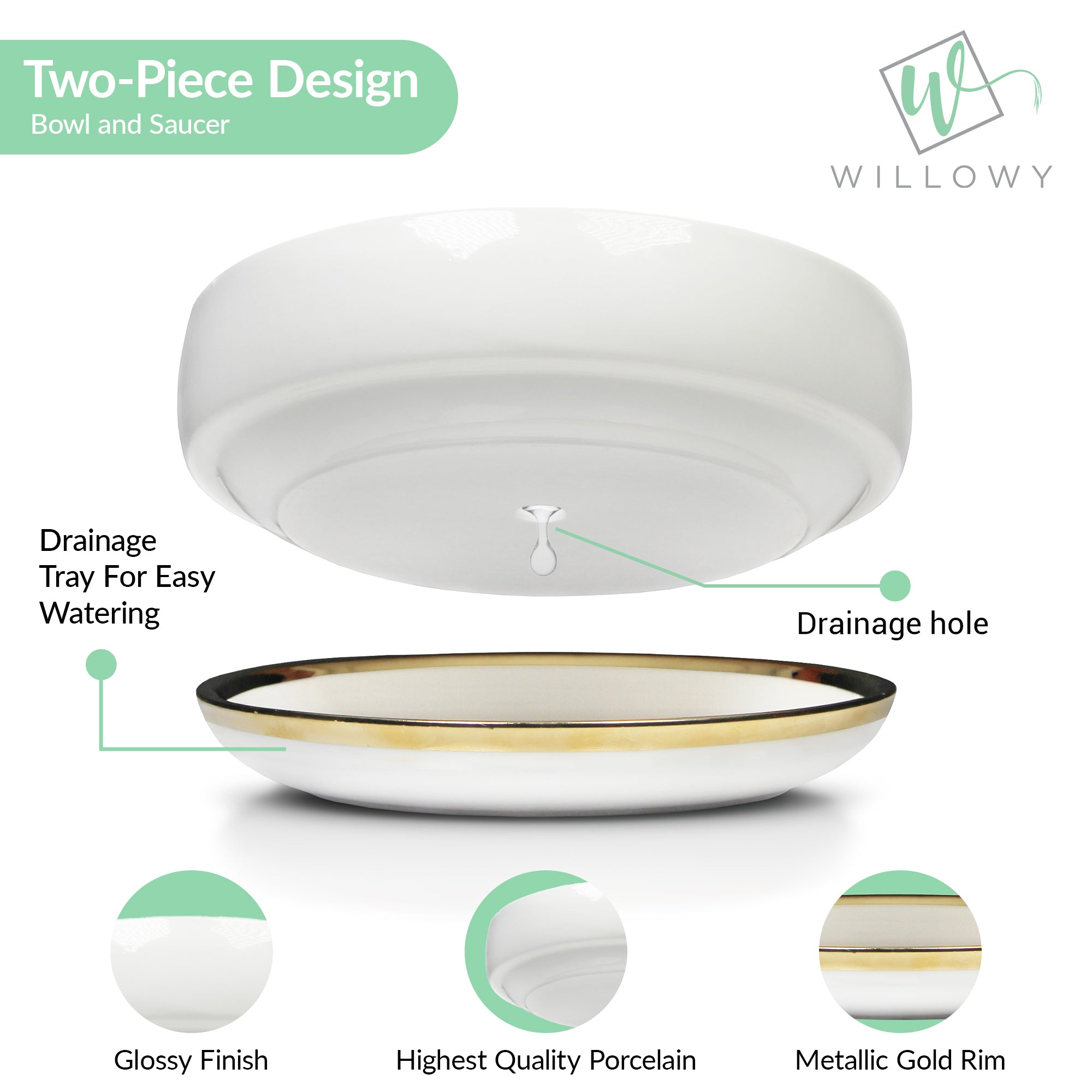 The Willowy 6 inch succulent bowl is an elegant two piece ceramic planter that incorporates a saucer into its design. It has a creamy white, high gloss finish with a shiny golden rim on the saucer. It includes a drainage plug, screen, silicone feet, and a sample of the multi-color decorative pebbles. It's an absolutely gorgeous, high-quality product. This patent pending design is the best small plant bowl available on Amazon.
