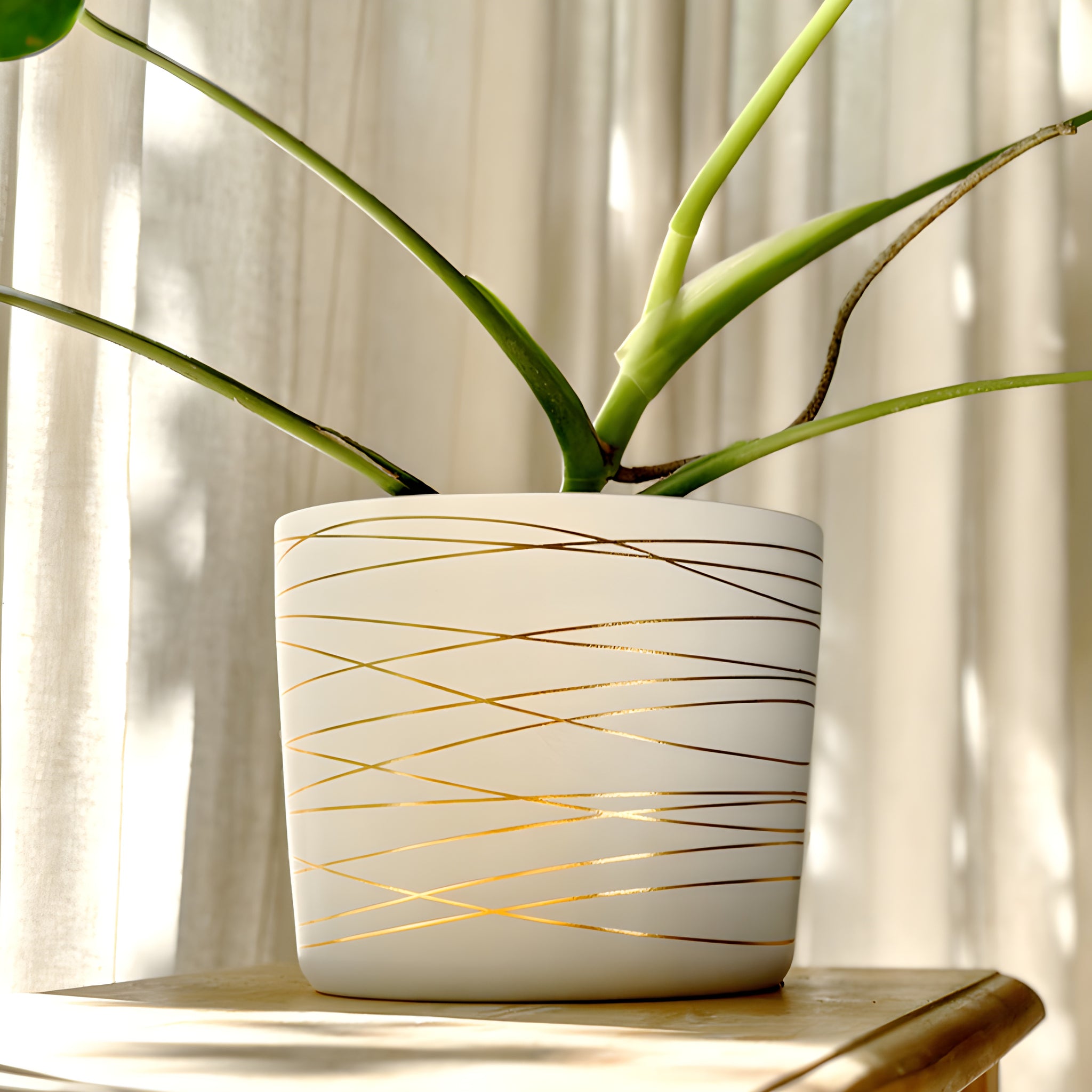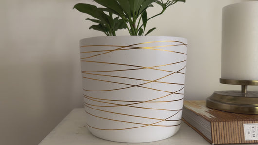 9 Inch Ceramic Plant Pot - Matte White with Gold Stripes