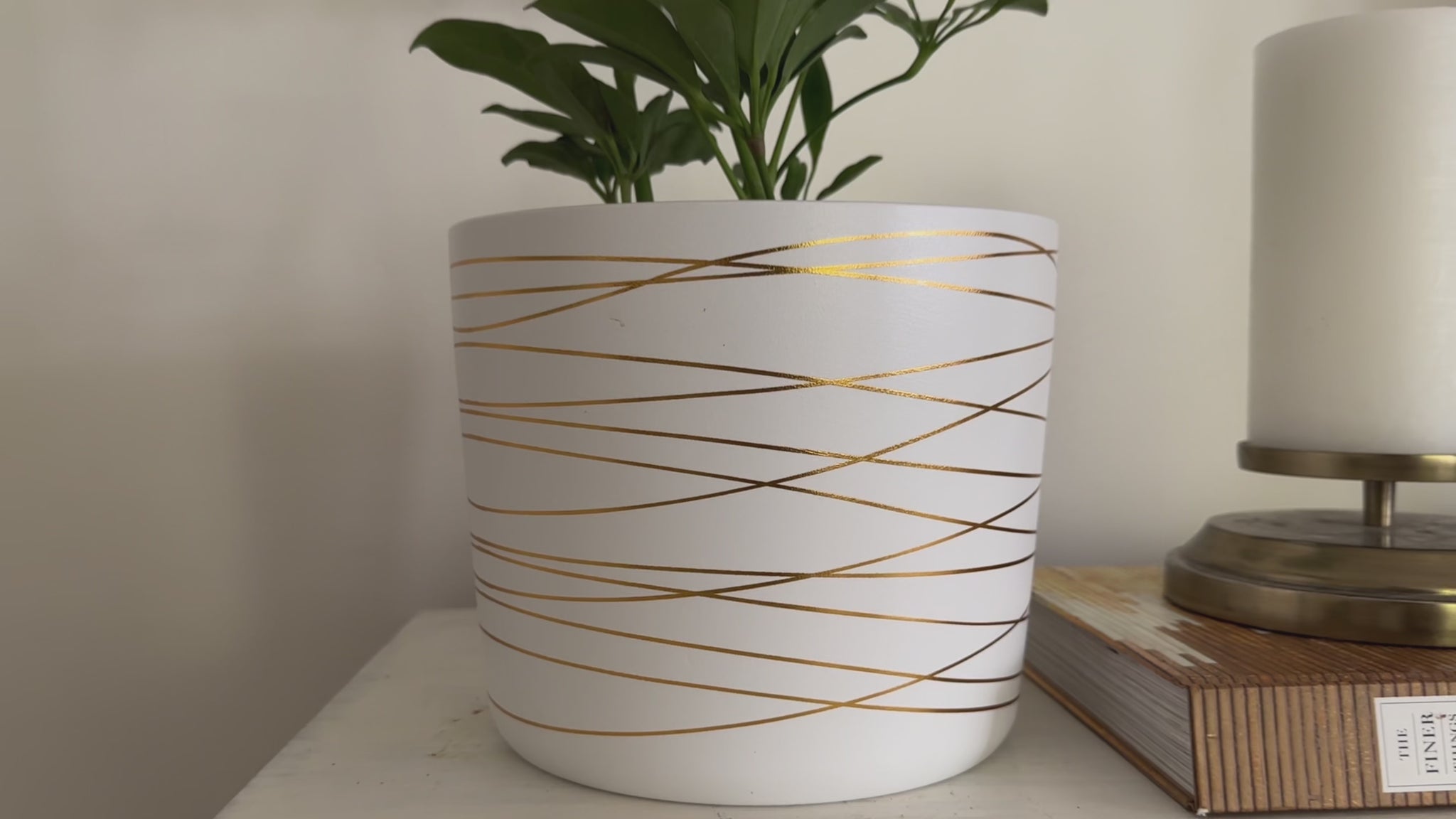 This pot is made from heavy-duty ceramic. It has a matte white finish with metallic gold stripes.